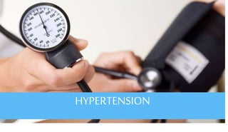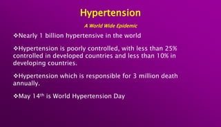 Hypertension, or high blood pressure, affects nearly 1 billion people worldwide. It is a leading cause of death and is poorly controlled in many countries. May 14th is recognized as World Hypertension Day to increase awareness. Hypertension is defined as a systolic blood pressure over 140 mmHg or a diastolic over 90 mmHg. Lifestyle modifications like weight loss, dietary changes, and increased physical activity can help control blood pressure but medication is often required. Treatment goals are to reduce blood pressure below 140/90 mmHg or 130/80 for those with diabetes or kidney disease to lower the risks of complications.