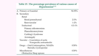 The document outlines guidelines for hypertension management, including recommended blood pressure targets and treatment options for different stages of hypertension. It emphasizes the importance of lifestyle modifications alongside pharmacotherapy, particularly for varying risk categories and specific patient needs. Additionally, it provides a review of clinical clues for primary and secondary hypertension and discusses the management of resistant cases.