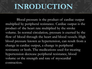 The document discusses hypertension, defining it as elevated blood pressure with specific systolic and diastolic thresholds. It outlines the causes, risk factors, classifications, symptoms, and treatment options, including both first-line and second-line medications. The management strategies also emphasize lifestyle changes, dietary modifications, and nursing considerations for effective control of high blood pressure.