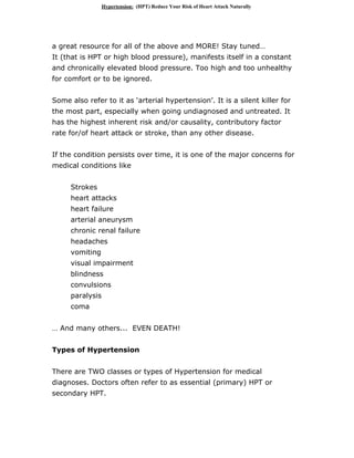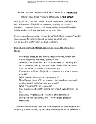 This document discusses hypertension (high blood pressure) and provides information about its causes, risks, diagnosis, and treatment. Doctors typically recommend lifestyle changes like exercise, diet, and nutrition to treat hypertension. Left untreated, hypertension increases the risks of heart attack, stroke, heart failure, and other serious health issues. The document recommends natural ways to lower blood pressure and reduce heart attack risks, such as following a healthy diet and lifestyle.