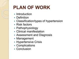 The document discusses hypertension, defining it as a condition characterized by sustained high blood pressure, and explores its various types, risk factors, and pathophysiology. It details clinical manifestations, assessment methods, and management strategies, including lifestyle changes and pharmacological treatments. Additionally, it emphasizes the importance of monitoring and early intervention to prevent complications associated with hypertension.