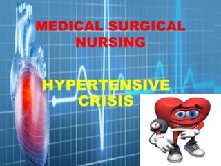 This document discusses hypertensive crisis, including its definition, causes, risk factors, clinical manifestations, diagnostic evaluation, and management. Hypertensive crisis is defined as a sudden severe elevation in blood pressure that can cause end organ damage if not promptly treated. The most common cause is poorly controlled essential hypertension. Clinical manifestations depend on the affected end organ and may include seizures, pulmonary edema, kidney injury, or retinal hemorrhage. Treatment involves rapidly lowering blood pressure by 20-25% using intravenous antihypertensive drugs to prevent further organ damage.