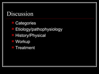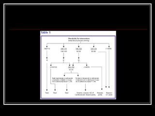 This document discusses hypertensive emergencies, which are severe cases of high blood pressure that result in acute organ damage. It defines categories of hypertensive states and provides details on etiology, pathophysiology, presentation, workup, and treatment of hypertensive emergencies. Treatment involves identifying the affected organ system and gradually lowering blood pressure over hours to days to prevent further organ injury, using intravenous medications like nitroprusside, labetalol, or nicardipine depending on the situation. Specific guidance is provided for rapidly lowering blood pressure in conditions like hypertensive encephalopathy, intracerebral hemorrhage, and ischemic stroke.