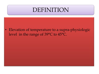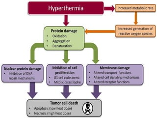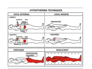 This document discusses hyperthermia, which involves raising body temperature to treat cancer. It defines hyperthermia as elevating temperature to 39-45°C. The document then covers the history of hyperthermia, mechanisms of its cytotoxic effects, its physiology and effects on cell survival. It discusses combining hyperthermia with radiation therapy and chemotherapy to enhance their effects. Finally, it outlines different modalities used to deliver hyperthermic treatment, including electromagnetic heating methods like microwave and radiofrequency.