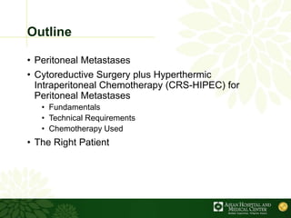 Cytoreductive surgery plus hyperthermic intraperitoneal chemotherapy (CRS-HIPEC) is emerging as a new standard treatment for peritoneal surface malignancies. Traditionally, peritoneal carcinomatosis was considered incurable and treated only with palliative chemotherapy. However, CRS-HIPEC aims to remove all visible tumor deposits surgically and then uses heated chemotherapy in the abdominal cavity to target any remaining microscopic disease. Studies show CRS-HIPEC provides significantly longer survival times compared to intravenous chemotherapy alone, with median overall survivals of 16-36 months. Experts indicate CRS-HIPEC should now be considered the standard of care for select patients with peritoneal metastases from conditions like ovarian