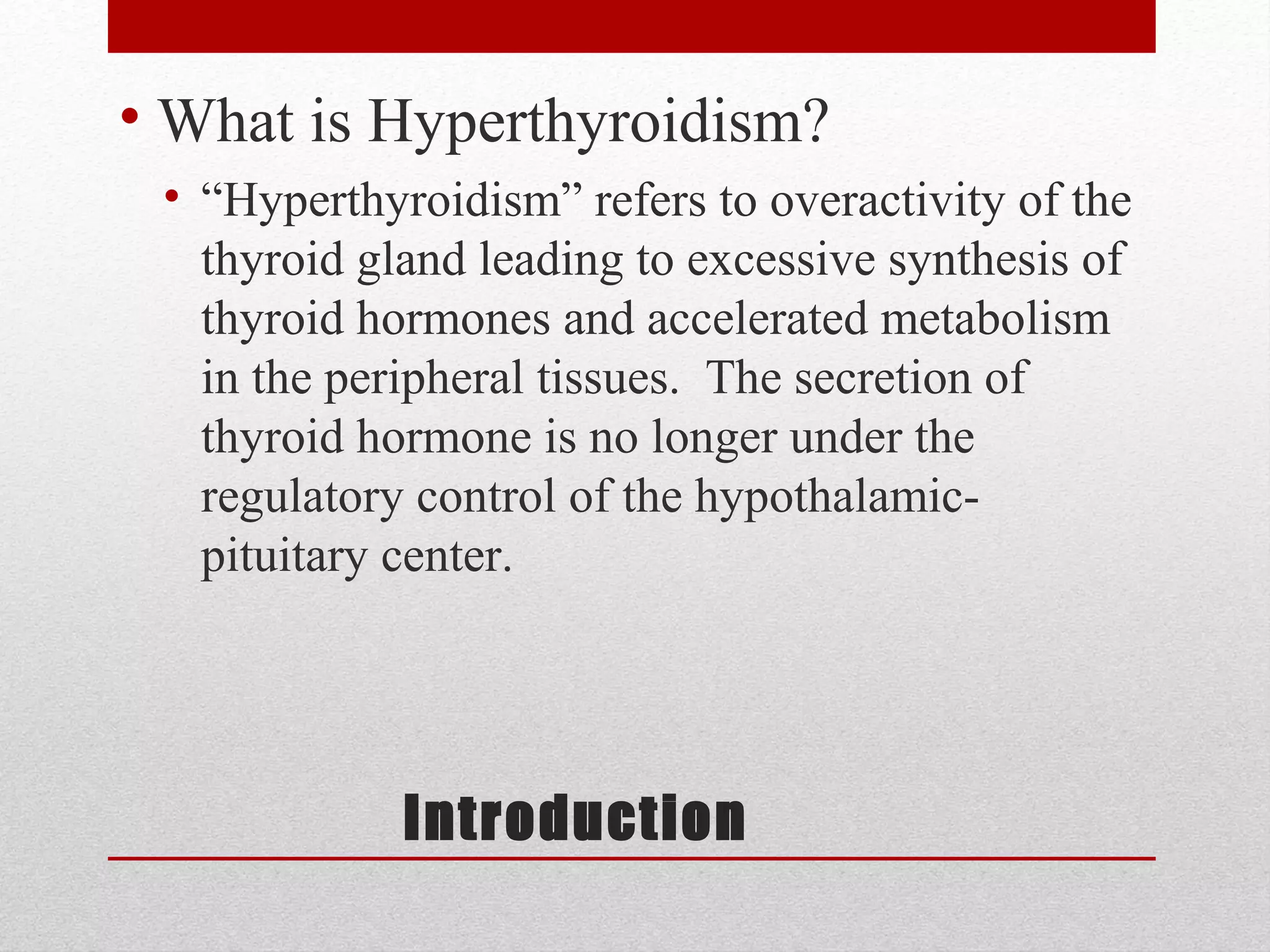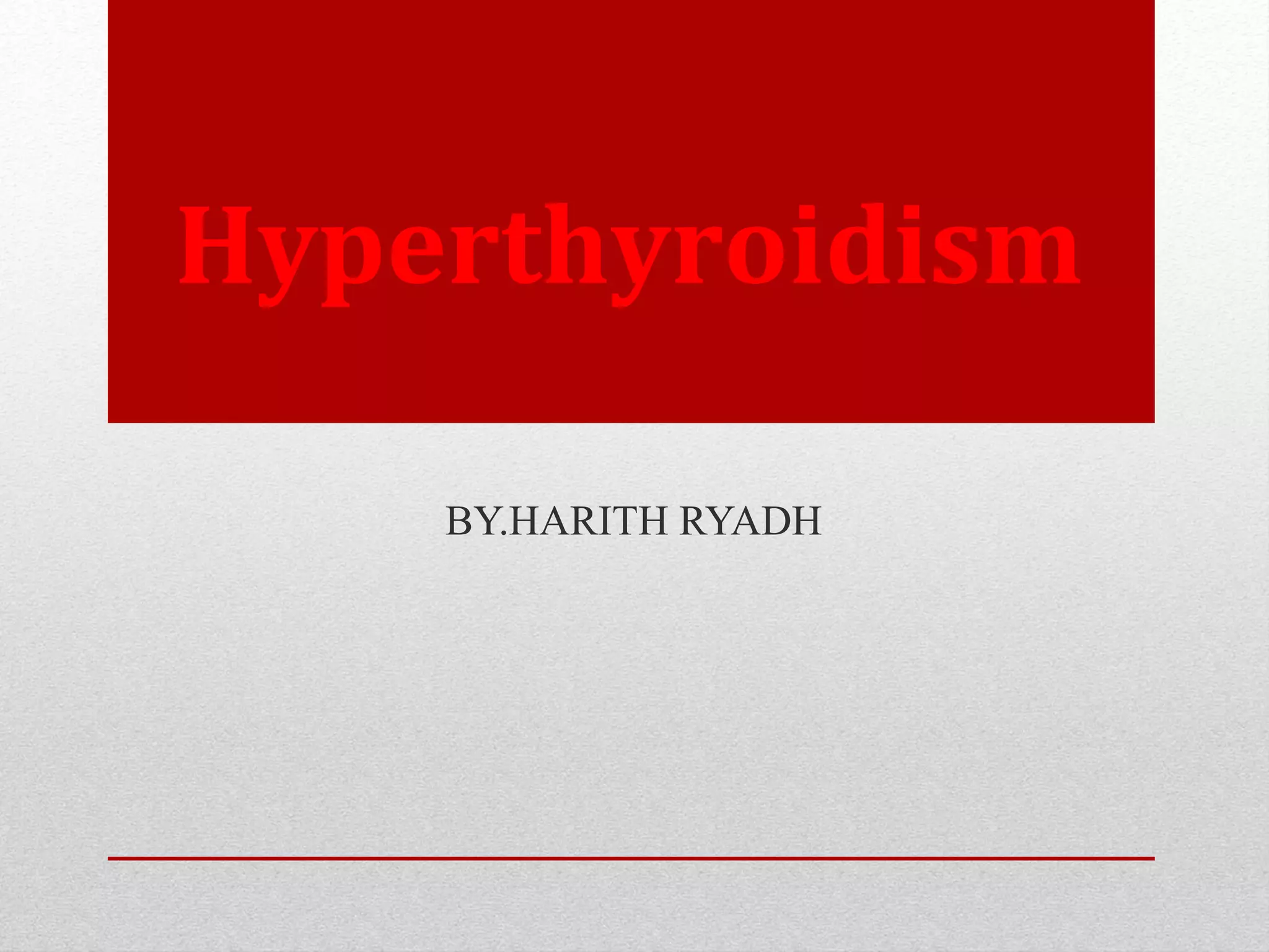 Hyperthyroidism refers to an overactive thyroid gland that produces excessive thyroid hormones. The most common cause is Graves' disease, an autoimmune disorder. Symptoms include hyperactivity, mood swings, difficulty sleeping, rapid heart rate, weight loss, and bulging eyes. It is diagnosed through blood tests measuring thyroid hormone and TSH levels. Treatment options include antithyroid medication, radioactive iodine therapy, or surgery to remove part of the thyroid gland.