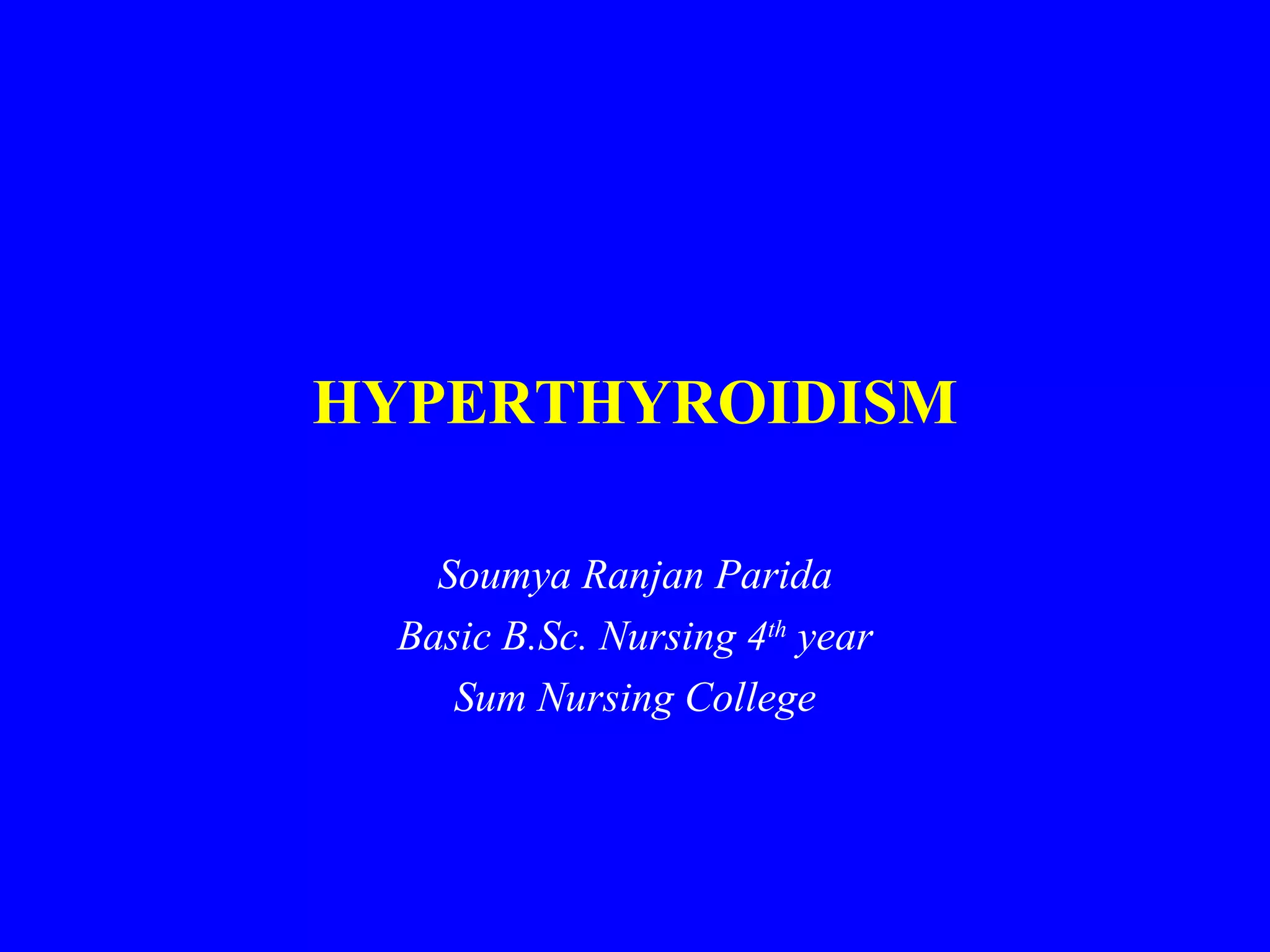 This document discusses hyperthyroidism, its causes, clinical manifestations, diagnosis, and treatment. The main causes discussed are Graves' disease, toxic multinodular goiter, and toxic adenomas. Graves' disease is an autoimmune disorder causing thyroid infiltration. Clinical manifestations include symptoms of hyperthyroidism as well as signs specific to Graves' such as ophthalmopathy. Diagnosis involves thyroid hormone blood tests. Treatment options include antithyroid medications, radioactive iodine therapy, and subtotal thyroidectomy. Congenital hyperthyroidism can occur when mothers pass antibodies to their infants and requires similar treatments.