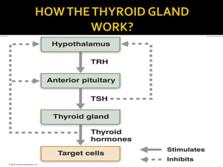 Hyperthyroidism is a condition where the thyroid gland produces excess thyroid hormones, causing a hypermetabolic state known as thyrotoxicosis. The most common cause is Graves' disease, an autoimmune disorder. Symptoms include weight loss, rapid heartbeat, sweating and irritability. Diagnosis involves blood tests to check thyroid hormone levels and treatment options include antithyroid medications, radioactive iodine therapy or surgery. Left untreated, hyperthyroidism can lead to complications affecting various body systems and organs.