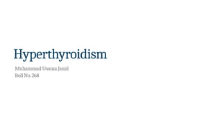 The document discusses hyperthyroidism, characterized by excessive thyroid hormone production leading to symptoms such as weight loss, heat intolerance, and tachycardia. It covers various subtypes, including primary and central hyperthyroidism, causes like Graves' disease and toxic adenomas, and treatment options including beta blockers and radioiodine ablation. Additionally, it highlights the critical condition of thyroid storm and its management.