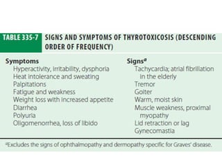 Thyrotoxicosis, primarily driven by hyperthyroidism, is characterized by hyperthyroid hormone levels and can manifest in conditions like Graves' disease, which accounts for a majority of cases. Key features include various clinical manifestations, including Graves' ophthalmopathy, and treatment options such as antithyroid drugs, radioactive iodine ablation, and surgery. Diagnosis requires careful hormonal evaluation, and the management approach varies based on the severity of symptoms and associated conditions.