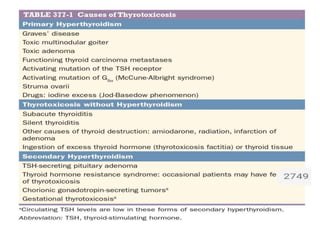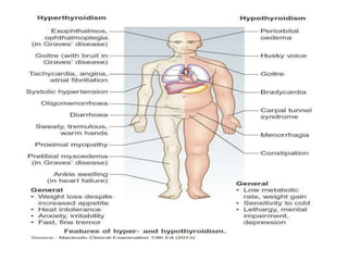 This document provides an overview of hyperthyroidism and its management. It discusses the main causes and clinical features of hyperthyroidism, focusing on Graves' disease which accounts for 60-80% of cases. The pathogenesis involves genetic and environmental factors leading to thyroid-stimulating immunoglobulins that cause excessive thyroid hormone production. Management includes antithyroid medications, radioiodine therapy, or thyroidectomy. Antithyroid drugs are usually the first line treatment but have potential adverse effects. Radioiodine is an alternative that destroys thyroid tissue over time. Considerations for special populations like pregnant women are also covered.