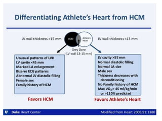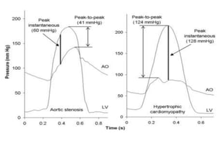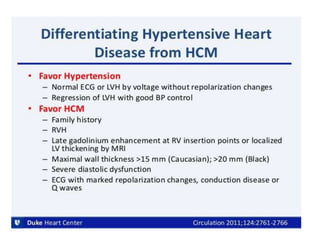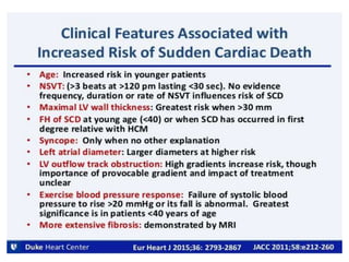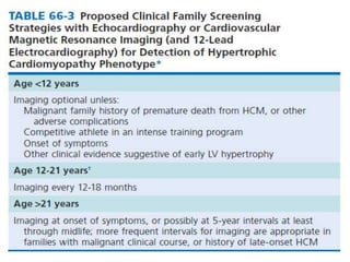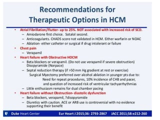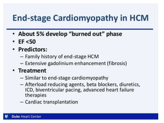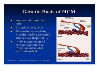 - The pathophysiology of HCM involves left ventricular outflow tract obstruction from systolic anterior motion of the mitral valve, diastolic dysfunction, and microvascular dysfunction leading to myocardial ischemia and scarring. These factors predispose to heart failure, atrial fibrillation, and ventricular arrhythmias.