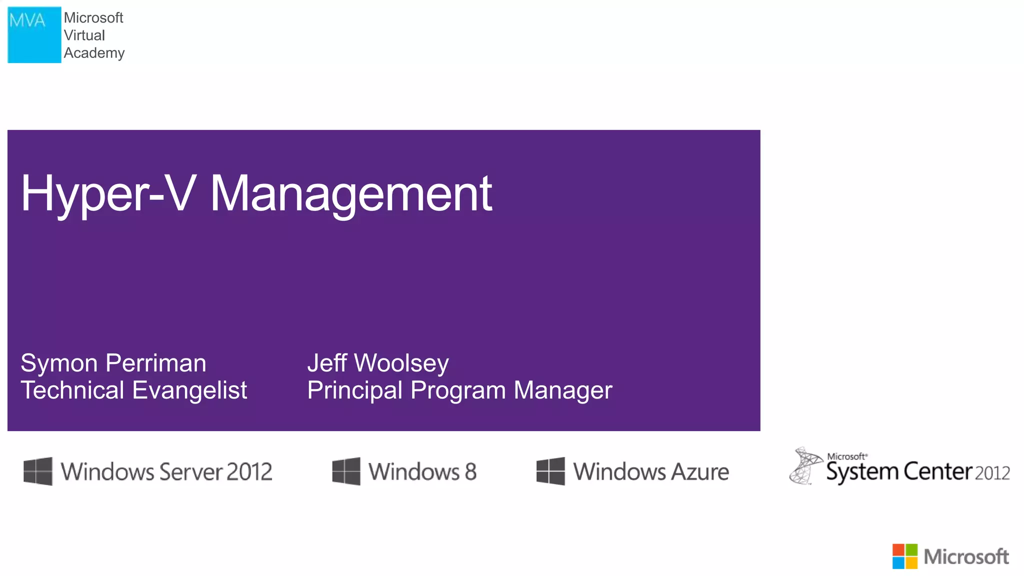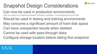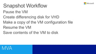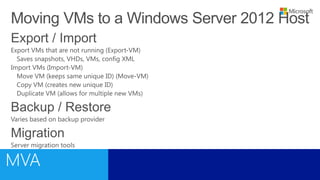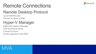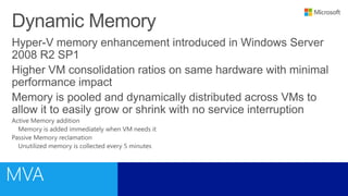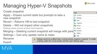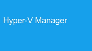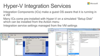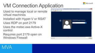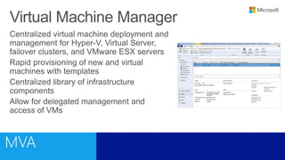 This document outlines a training course on Microsoft Virtualization. The course is divided into two halves, with the first half covering introductory topics like Hyper-V infrastructure and networking, and the second half focusing on advanced topics such as Hyper-V management, high availability, and integration with System Center 2012. Management options for Hyper-V are also discussed, including using Hyper-V Manager, Windows PowerShell, and System Center Virtual Machine Manager for large environments.