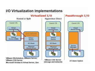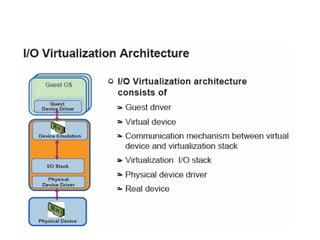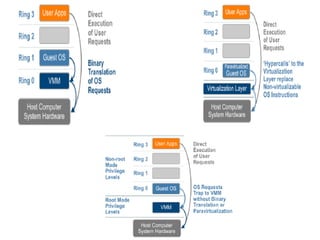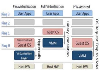 The document describes hypervisors and their role in virtualization. It discusses how a hypervisor sits between virtual machines and hardware to provide an isolated environment for each VM. It also compares different types of hypervisors, including describing how early hypervisors used full virtualization through trap-and-emulate to virtualize privileged instructions. The document then discusses the design conditions for a hypervisor based on Popek and Goldberg's virtualization theorem, including how the hypervisor must provide equivalence, performance, and resource control for virtual machines.