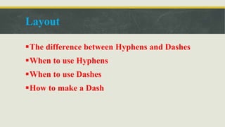 This document discusses the differences between hyphens and dashes and provides guidelines for their proper usage. Hyphens are used to connect compound words and prefixes, while dashes can be used to indicate interruptions, emphasize parts of sentences, or connect numbers and extend sentences. The document provides examples of when to use hyphens, such as in compound adjectives and nouns, as well as prefixes. It also gives examples of when to use dashes, such as in times, dates, compound adjectives with equal parts, and to extend sentences. Finally, it provides instructions for typing dashes on different operating systems.