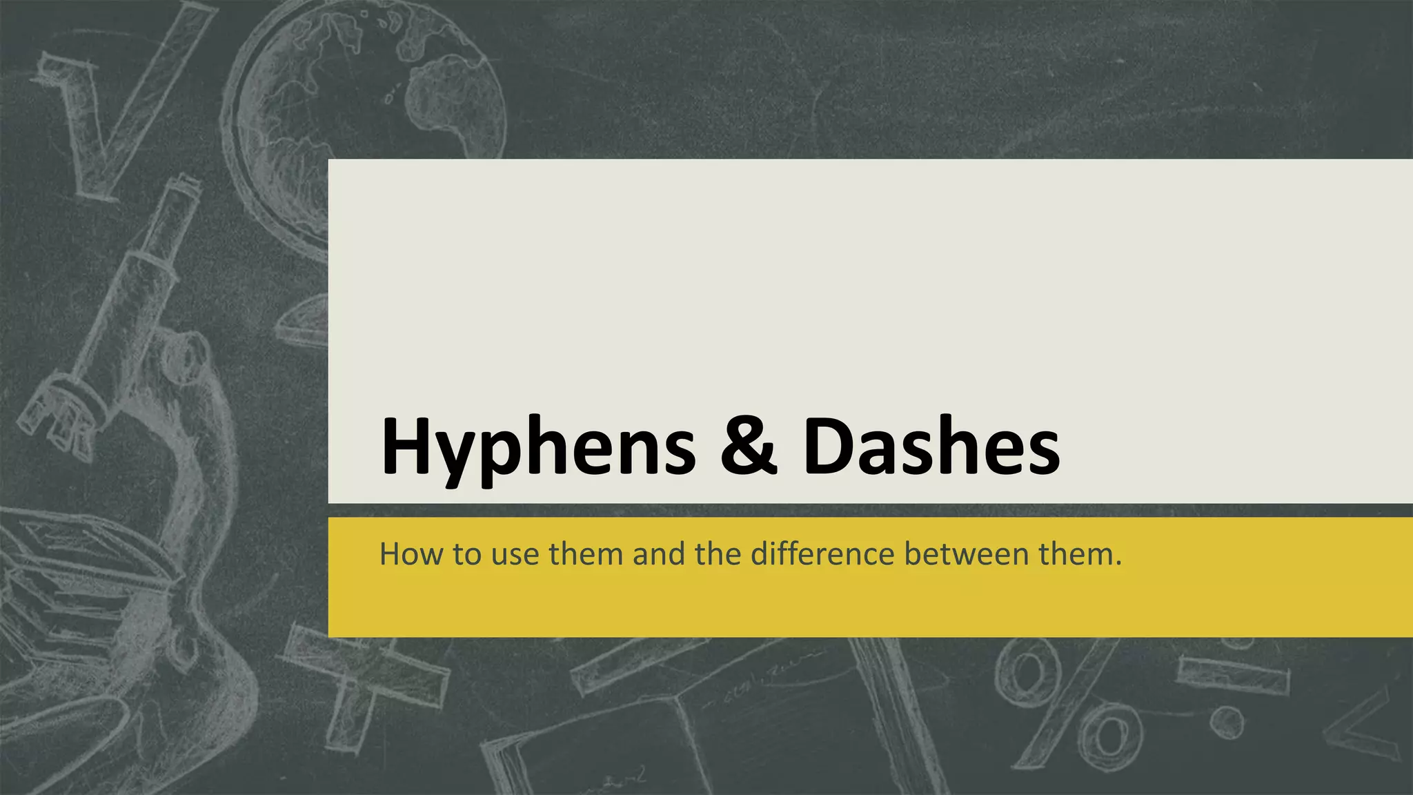 This document discusses the difference between hyphens and dashes in writing. Hyphens are used to connect two or more relevant words to show they form a single entity, such as in compound adjectives and nouns. Dashes are longer than hyphens and can be used to indicate interruptions or emphasis in sentences or to connect numbers and compound adjectives with equal parts. The key differences are that hyphens connect words, while dashes are used to emphasize or interrupt parts of sentences.