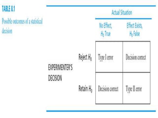 The document discusses hypothesis testing, which is a statistical method used to determine if a claim about a population parameter is true. It involves setting a null and alternative hypothesis, choosing a test statistic, determining critical values, and making a conclusion about whether to reject or fail to reject the null hypothesis based on comparing the test statistic to critical values. Examples provided include testing claims about a motorcycle's mileage, a banana's weight, and the effectiveness of a medicine.