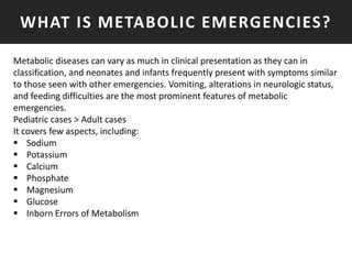 The document discusses metabolic emergencies, particularly focusing on hypoglycemia, which is characterized by low plasma glucose levels and associated neurological symptoms. It outlines the hormonal regulation of glucose homeostasis, classifications, causes, clinical features, and management strategies for hypoglycemia, emphasizing early detection and treatment. Treatment options include oral and IV carbohydrate replacement, glucagon, and addressing underlying causes to prevent recurrence.