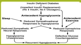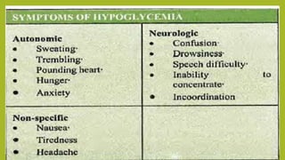 Hypoglycemia, or low blood sugar, is caused by very low levels of blood glucose, below 3.0 mmol/L. It is common in type 1 diabetes and can occur due to overdose of insulin or diabetes medications, excessive alcohol consumption, or certain illnesses. Symptoms range from irregular heartbeat and sweating to confusion and loss of consciousness. Treatment involves giving the person glucose tablets, juice, or an IV glucose solution to quickly raise their blood sugar levels. Preventing hypoglycemia requires education on recognizing symptoms early and always having access to fast-acting carbohydrates.