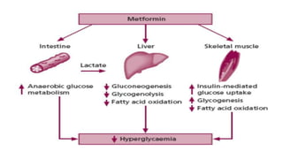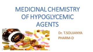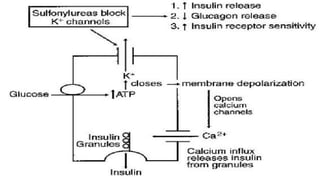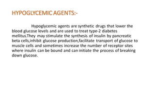 This document discusses different classes of hypoglycemic agents used to treat type 2 diabetes. It describes 5 classes: sulfonyl ureas, biguanides, thiazolidinediones, alpha-glucosidase inhibitors, and meglitinides/phenylalanine analogues. Sulfonyl ureas work by stimulating insulin secretion from pancreatic beta cells. Biguanides like metformin increase insulin sensitivity. Thiazolidinediones are insulin sensitizers that enhance insulin action in target tissues like liver and muscle. Alpha-glucosidase inhibitors prevent glucose absorption from the gut. Meglitinides stimulate acute insulin release. The document provides examples of drugs in each class and briefly summarizes their mechanisms of action and