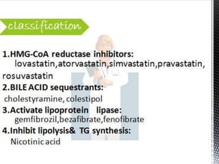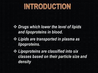 This document discusses lipoproteins and drugs that lower lipid levels. It begins by defining lipoproteins and how they transport lipids in blood, classifying them into six groups. It then discusses the functions of different lipoproteins and causes of hyperlipoproteinemias. The document focuses on statins, how they work by inhibiting HMG-CoA reductase, and their effects on cholesterol, LDL, HDL, and triglyceride levels. It covers the pharmacokinetics of statins, their adverse effects and uses. Other drug classes discussed include bile acid sequestrants, fibrates, nicotinic acid and their mechanisms and uses for treating different lipid abnormalities.