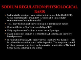 This document discusses sodium regulation and hyponatremia. It outlines that sodium is the main extracellular cation and helps regulate blood pressure and volume. The kidneys aim to balance sodium intake and excretion. Hormones like renin, angiotensin II, aldosterone increase sodium reabsorption while ANP increases excretion. Hyponatremia is defined as a sodium level below 135 mmol/L and can be hypovolemic, euvolemic, or hypervolemic depending on volume status. Evaluation involves assessing volume status, electrolytes, osmolality and urine studies to determine the underlying cause.