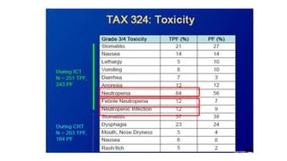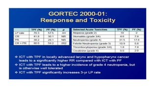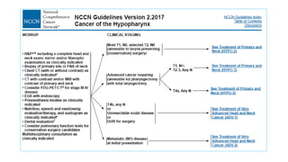 This document summarizes guidelines for the management of carcinoma of the hypopharynx and larynx. It covers topics like NCCN guidelines, treatment options including surgery, radiotherapy, chemotherapy and biological therapy. It describes TNM staging according to AJCC 7th edition and provides general treatment recommendations based on tumor stage. It discusses the benefits of radiotherapy over surgery and indications for primary radiotherapy. It also summarizes various studies comparing altered fractionation radiotherapy with or without chemotherapy to conventional radiotherapy for improved survival outcomes in advanced stage disease.