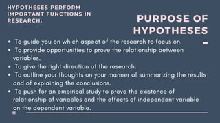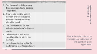 The document discusses several hypotheses about a political candidate named Garcia and the results of a recent survey. It considers whether the survey results could discourage Garcia's supporters or indicate his winnable position. It also notes that survey results do not guarantee a candidate's chances of winning and that vote buying may have caused Garcia to lose candidacy in Sta. Fe. References are provided.