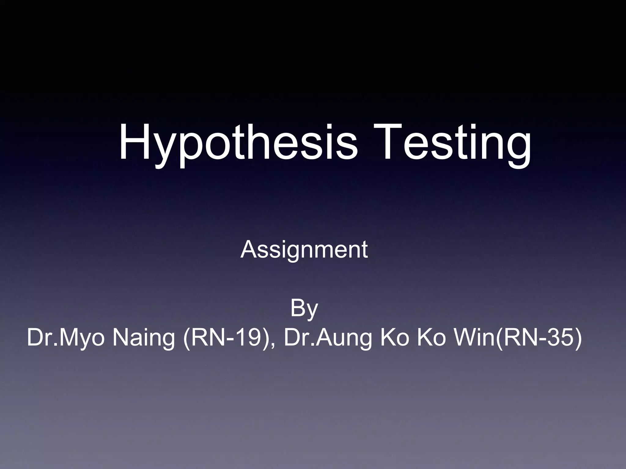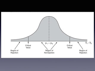 The document discusses hypothesis testing, including defining the null and alternative hypotheses, types of errors, test statistics, and the process of hypothesis testing. Some key points:
