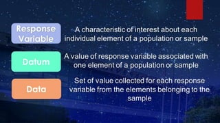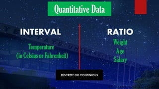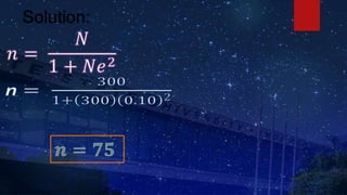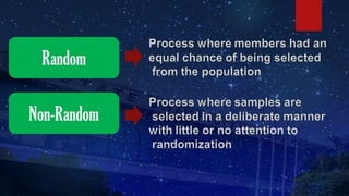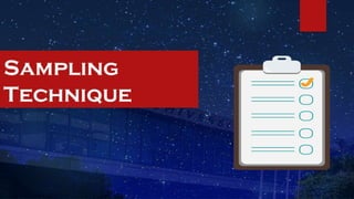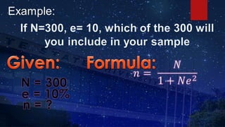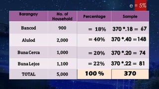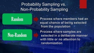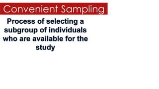The document discusses research hypotheses, detailing type I and type II errors, and outlines various aspects of research design including data sources, participant selection, and sampling techniques. It explains methods for sampling like simple random sampling, systematic sampling, stratified sampling, cluster sampling, and quota sampling along with how to determine sample size. Additionally, it highlights the processes involved in data gathering and statistical treatment of primary and secondary data.