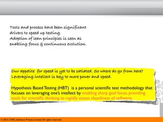 The document discusses hypothesis based testing (HBT) as a powerful methodology for improving software testing speed and effectiveness by leveraging intellect and lean principles. It outlines the structured process of HBT, focusing on cleanliness criteria, potential defect types, and quality levels while providing a case study that demonstrates the effectiveness of HBT over conventional approaches. Key benefits include increased test coverage, reduced post-release defects, and improved efficiency in testing processes.