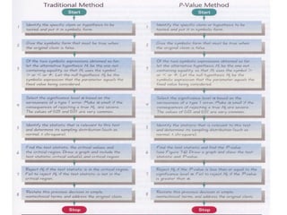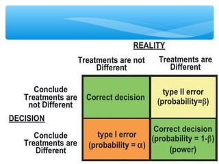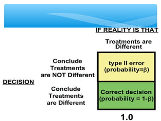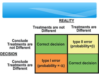 This document discusses hypothesis testing, which involves drawing inferences about a population based on a sample from that population. It outlines the key elements of a hypothesis test, including the null and alternative hypotheses, test statistics, critical regions, significance levels, critical values, and p-values. Type I and Type II errors are explained, where a Type I error involves rejecting the null hypothesis when it is true, and a Type II error involves failing to reject the null when it is false. The power of a hypothesis test is defined as the probability of correctly rejecting the null hypothesis when it is false. Controlling type I and II errors involves considering the significance level, sample size, and population parameters in the null and alternative hypotheses.