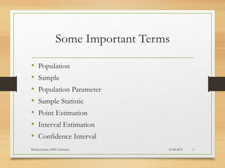 The document discusses hypothesis testing including key terms such as null and alternative hypotheses, significance levels, and types of hypothesis tests (one-tailed and two-tailed). It outlines the steps involved in hypothesis testing, potential errors, and the application of p-values for decision making. Additionally, it provides examples and differentiates between parametric and non-parametric tests based on the type of data.