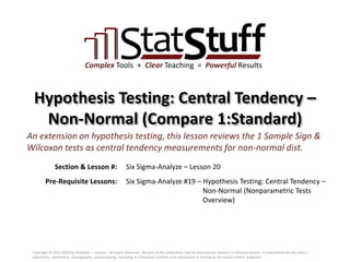 The document outlines the importance of hypothesis testing and its role in identifying root causes through the construction of transfer functions. It details a practical framework for conducting hypothesis tests, including defining objectives, stating hypotheses, and interpreting results, while providing guidance on selecting appropriate statistical tests based on data characteristics. Additionally, it emphasizes using non-parametric tests, such as the 1-sample sign and Wilcoxon tests, for analyzing non-normal distributions in understanding organizational metrics.