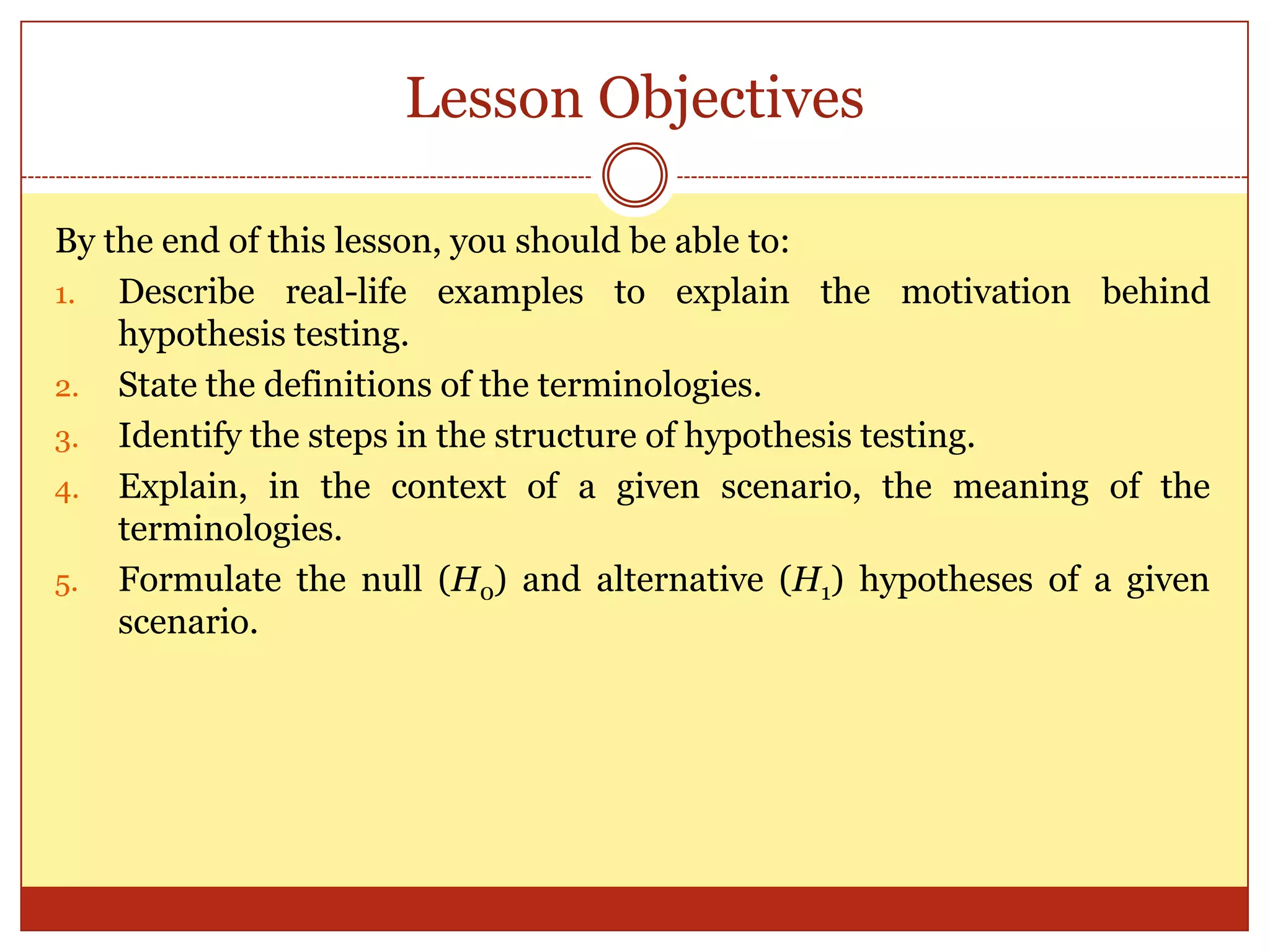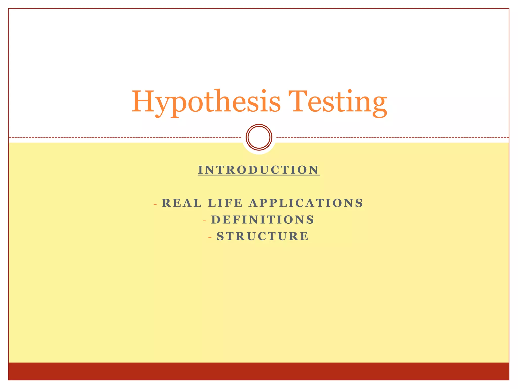 The document provides an introduction to hypothesis testing, including its real-life applications, key definitions, and structure. It defines hypothesis testing as the process of testing the validity of a statistical hypothesis based on a random sample from a population. The document outlines the common steps in hypothesis testing: 1) stating the null and alternative hypotheses, 2) choosing a significance level, 3) determining the test statistic and decision criteria, 4) rejecting or failing to reject the null hypothesis, and 5) drawing a conclusion. It also defines important terminology like population mean, null and alternative hypotheses, test statistic, significance level, critical region, and p-value. Real-life examples from pharmaceutical testing and legal cases are provided to illustrate the motivation for hypothesis