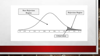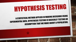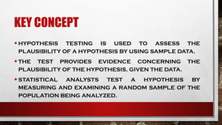 Hypothesis testing is a statistical method for making decisions based on experimental data, involving the evaluation of an assumption about a population. It consists of a null hypothesis (no significant difference) and an alternative hypothesis (indicating a real effect), with a four-step process for testing. Statistical significance is influenced by a level of significance (alpha), determining the likelihood of incorrect conclusions when the null hypothesis is true.