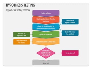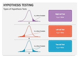 Hypothesis testing in statistics involves formulating a null hypothesis (H0) and an alternative hypothesis (H1) to assess claims about population properties. Critical concepts include the significance level, p-values, and test statistics, which help determine whether to reject the null hypothesis based on collected data. The document provides examples pertaining to various studies, highlighting the roles of H0 and H1 in evaluating differences or effects in research.