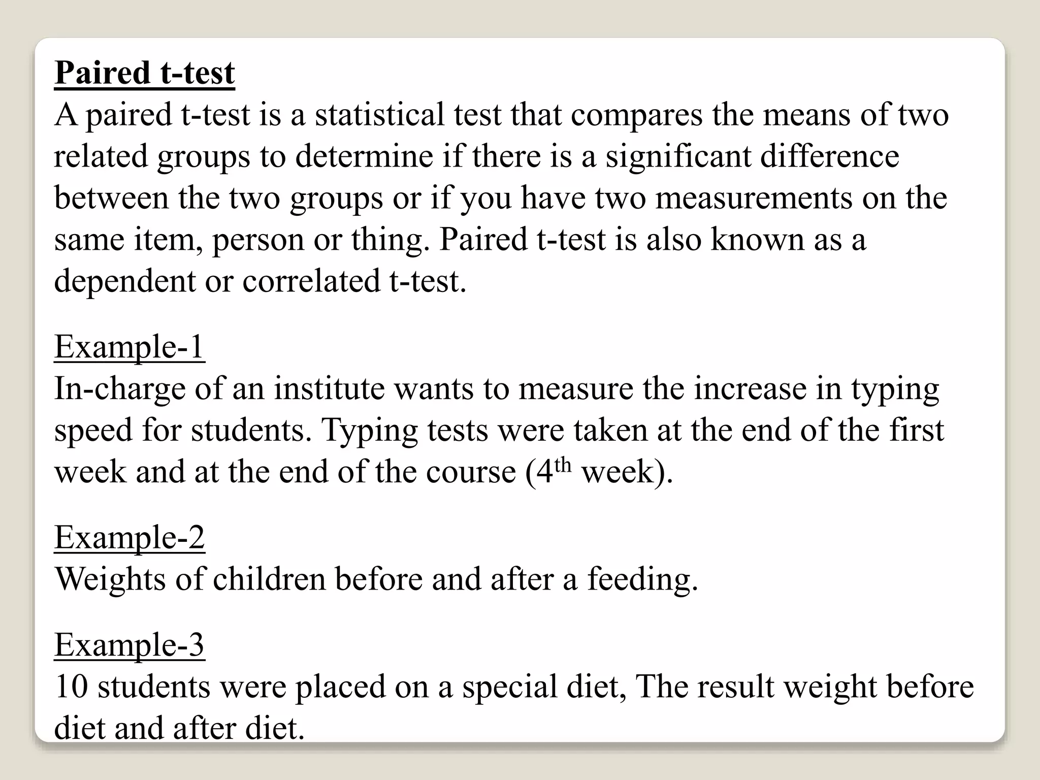 This document discusses paired t-tests and provides an example problem. It introduces paired t-tests as a statistical test used to compare the means of two related groups or measurements on the same item to determine if there is a significant difference. The example problem tests the hypothesis that students' average typing speed increased by over 30 words per minute after completing a typing course, using a paired t-test with a sample of 10 students' pre-and post-course typing speeds. The calculated t value is compared to the critical value to determine whether to reject the null hypothesis.