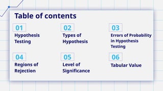 The document provides an overview of hypothesis testing in statistics, covering essential concepts such as types of hypotheses, probability errors, regions of rejection, and levels of significance. It explains the difference between the null and alternative hypotheses, the implications of type I and type II errors, and discusses the commonly used significance levels. Additionally, it highlights the role of tabular values in determining cutoff points for rejecting hypotheses.