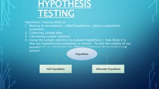 This document discusses parametric and non-parametric statistical tests used for hypothesis testing. It defines key concepts like the null hypothesis, alternate hypothesis, and test statistics. It explains parametric tests like the t-test, z-test, F-test, and ANOVA that assume a known population distribution. It also covers non-parametric tests like the chi-square test, Mann-Whitney U test, Wilcoxon signed rank test, sign test, and Kruskal-Wallis test that do not assume a known distribution. Each test is briefly described in terms of its assumptions, test statistic, and decision criteria for rejecting the null hypothesis.