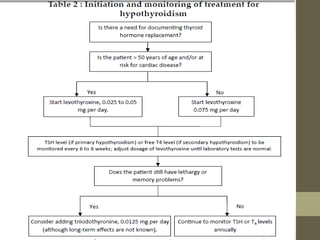 3. The clinical presentation of hypothyroidism is reviewed along with treatment considerations like increased thyroid hormone needs during pregnancy. Biochemical markers and expected signs of clinical improvement with treatment are summarized.