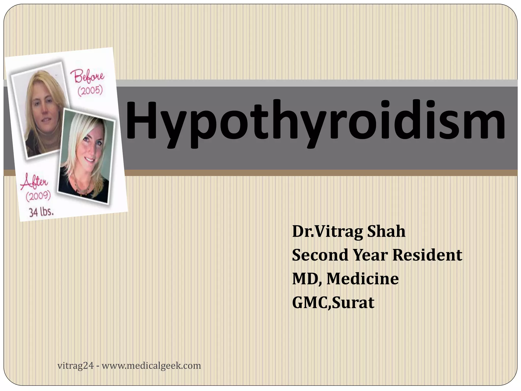 Hypothyroidism affects approximately 42 million people in India, with a prevalence rate of 3.9%, mostly in females and often increasing with age. It can be classified into primary, secondary, and other types, with various causes including autoimmune disorders and iodine deficiency. Early diagnosis and treatment are critical to prevent severe neurologic consequences, especially in congenital cases, while symptoms can range from fatigue and weight gain to more serious complications.