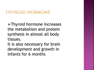Hypothyroidism is caused by low levels of thyroid hormones and can be primary or secondary. It can occur at any age but presents differently in infants (cretinism) and adults (myxedema). Cretinism results from congenital lack of the thyroid gland and is characterized by stunted growth and mental retardation. Untreated congenital hypothyroidism permanently impairs development. Myxedema in adults slows metabolism and causes non-pitting edema. Hypothyroidism is typically treated with daily levothyroxine replacement therapy to normalize thyroid stimulating hormone levels. Early diagnosis and treatment of congenital hypothyroidism is important for normal mental development.