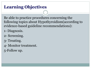 This document provides evidence-based guideline recommendations for diagnosing, screening, treating, monitoring treatment, and following up on hypothyroidism. It discusses recommendations for diagnosing hypothyroidism through TSH testing, screening high-risk groups but not asymptomatic adults, and treating with levothyroxine. It also provides guidance on monitoring treatment through periodic TSH testing, adjusting doses for elderly patients and those with heart conditions, and addressing persistent symptoms or high TSH levels despite treatment.