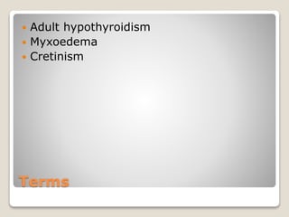 This document discusses different types of hypothyroidism including cretinism, adult hypothyroidism, and myxoedema. Cretinism is fetal or infantile hypothyroidism which can be endemic or sporadic and causes symptoms like a hoarse cry and umbilical hernia. Adult hypothyroidism causes symptoms like bradycardia, cold extremities, dry skin/hair, puffy eyes, hoarse voice, slowed movements, and delayed ankle jerks. Myxoedema is a severe form of hypothyroidism that requires treatment with oral thyroxine, triiodothyronine, or intravenous thyroxine along with corticosteroids and antibiotics.