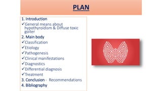 Hypothyroidism and diffuse toxic goiter (Graves' disease) are conditions caused by thyroid hormone imbalances. Hypothyroidism is caused by thyroid hormone deficiency and can be primary or central in nature. Diffuse toxic goiter is an autoimmune disease characterized by thyroid hormone excess and extrathyroid symptoms. Diagnosis involves blood tests of thyroid hormones and antibodies. Treatment depends on the condition but may include thyroid hormone replacement, anti-thyroid medications, radioiodine therapy, or surgery.