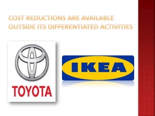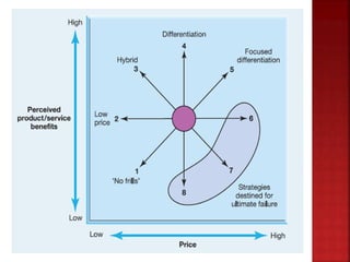 A hybrid strategy aims to achieve both differentiation and low prices relative to competitors. It succeeds by delivering enhanced benefits at lower prices while achieving sufficient margins for reinvestment. If differentiation is achieved, lower prices may not be needed as prices could match or exceed competitors. A hybrid strategy can also be used as an entry strategy by targeting volumes greater than competitors through cost reductions outside differentiated activities, allowing better margins due to a lower cost base.