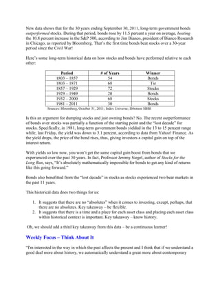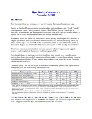 The European debt crisis continues as Greece's government remains unstable and Italy's borrowing costs rise sharply. While Greece has received bailouts, it is running out of money and time. Italy's rising bond yields suggest investors are losing faith in its ability to pay debts, and Italy is a much larger economy than Greece. High debt levels worldwide continue to cause market volatility until reduced to more manageable levels. Recent data shows that U.S. government bonds outperformed stocks over the past 30 years for the first time since the Civil War, though low current bond yields mean they cannot provide the same returns going forward. History shows there are no guarantees in investing and the appropriate asset class depends on economic conditions.