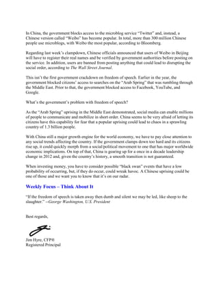The document summarizes market volatility in 2011 and discusses the Chinese government's crackdown on freedom of speech through restrictions on social media. Specifically: