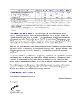 Volatility returned to the markets as the S&P 500 fell 2% for the week due to concerns over the European debt crisis and slowing growth in China. Spain became the latest problem country in Europe, while China's economy expanded at its weakest pace in over three years. Additionally, weak earnings reports from several U.S. banks led to weakness in financial stocks. Conflicting economic data from the U.S. also contributed to uncertainty and market swings. The "quitters" indicator from the JOLTS report provided a positive signal about consumer confidence, despite a disappointing jobs report and decline in consumer sentiment surveys.